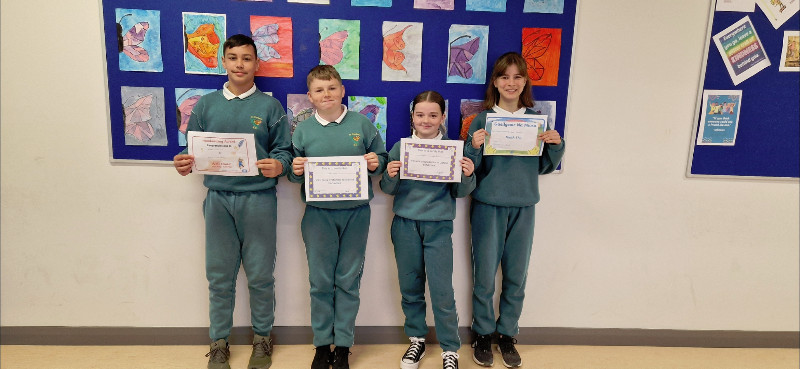 There were also four children who received certificates. Airidas for neat handwriting, Ryan Morgan and Caylee for not being bystanders to bullying, and Kiara for being Gaeilgeoir na Míosa.