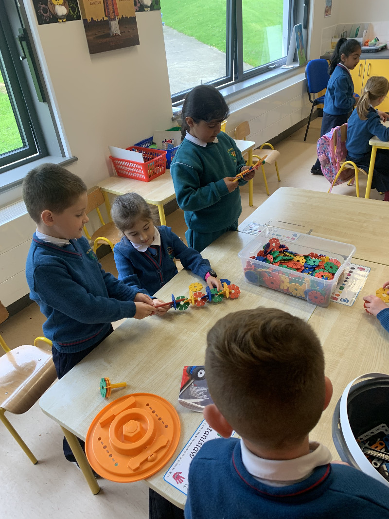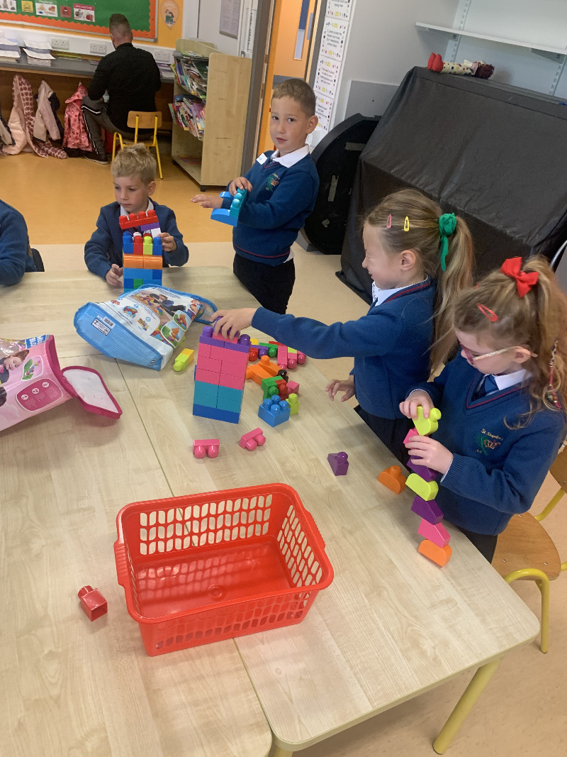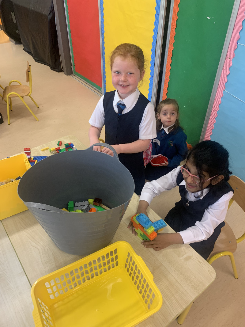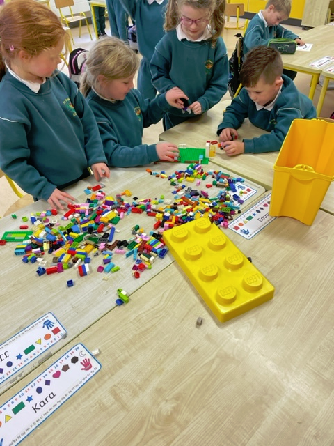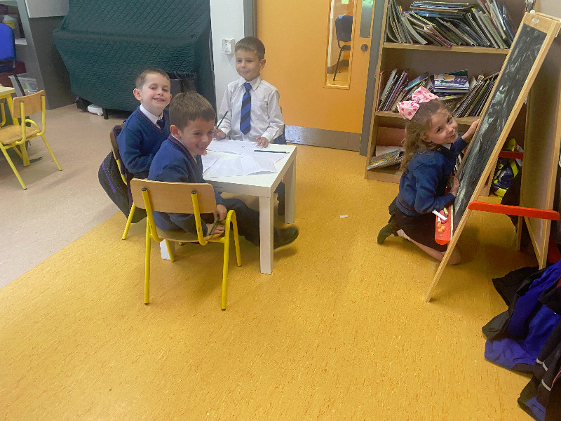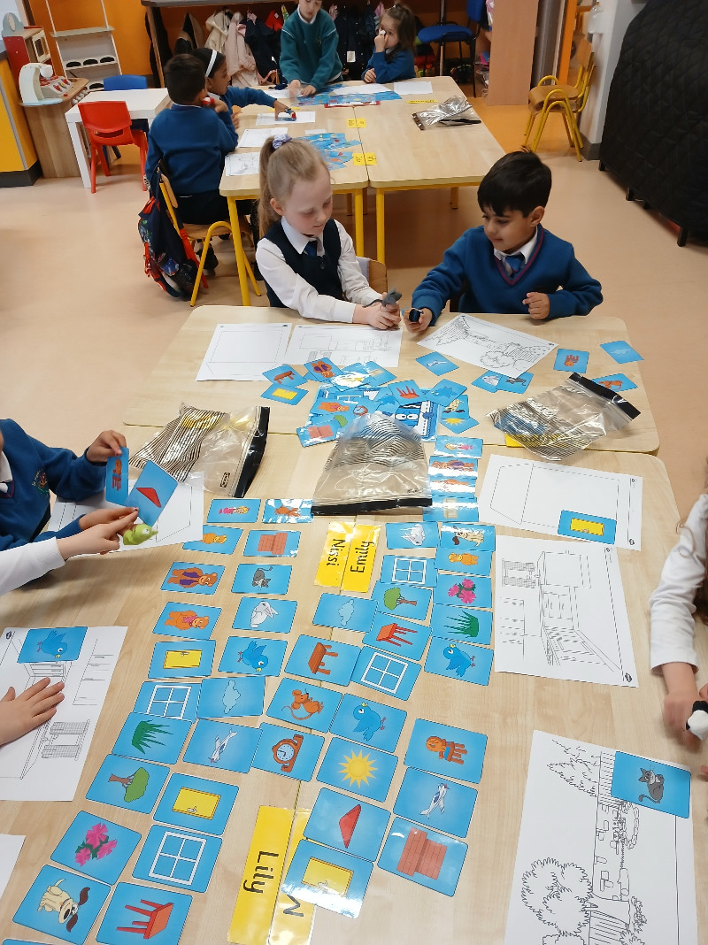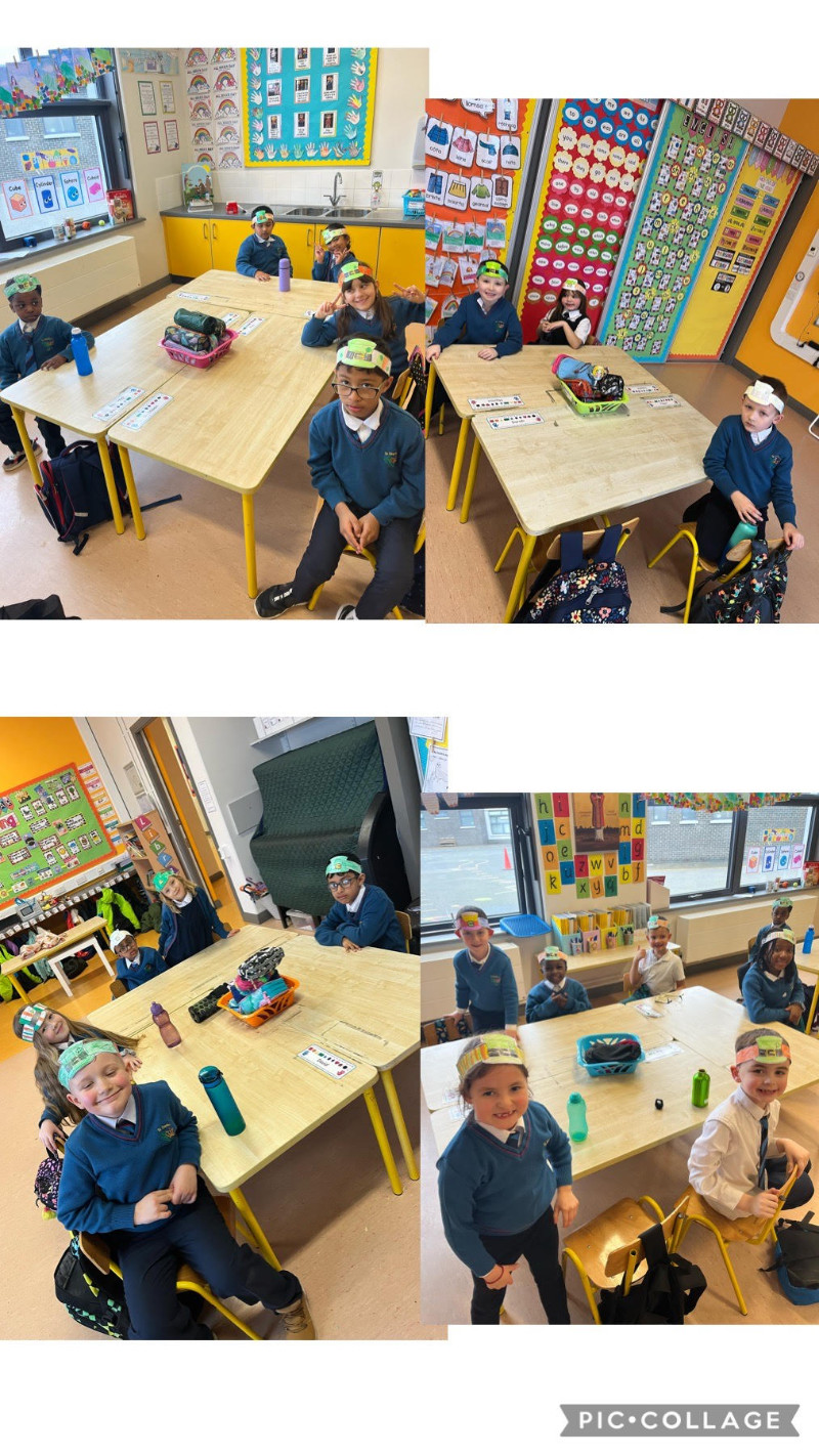 In Aistear we have been learning all about school. We particularly enjoyed the role play area where we took on the roles of teacher, secretary, SNA, caretaker, principal, etc. In our groups we collaboratively drew our dream school and we also designed our very own school jumpers. In the construction area we designed our own school buildings!