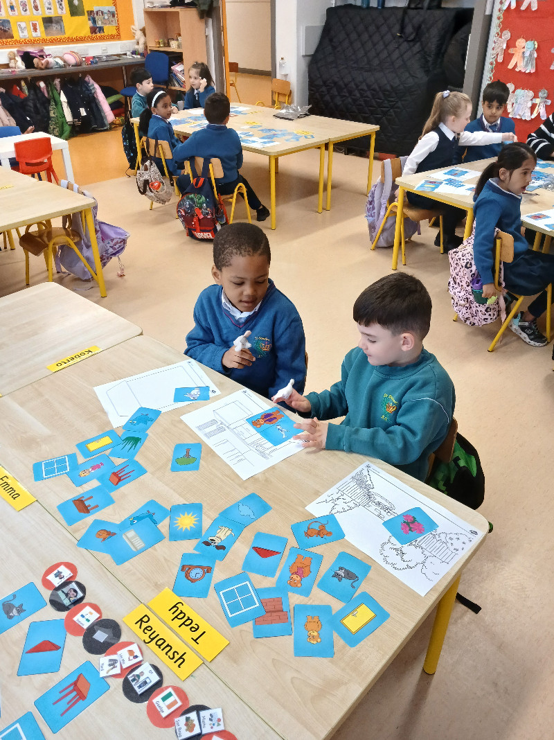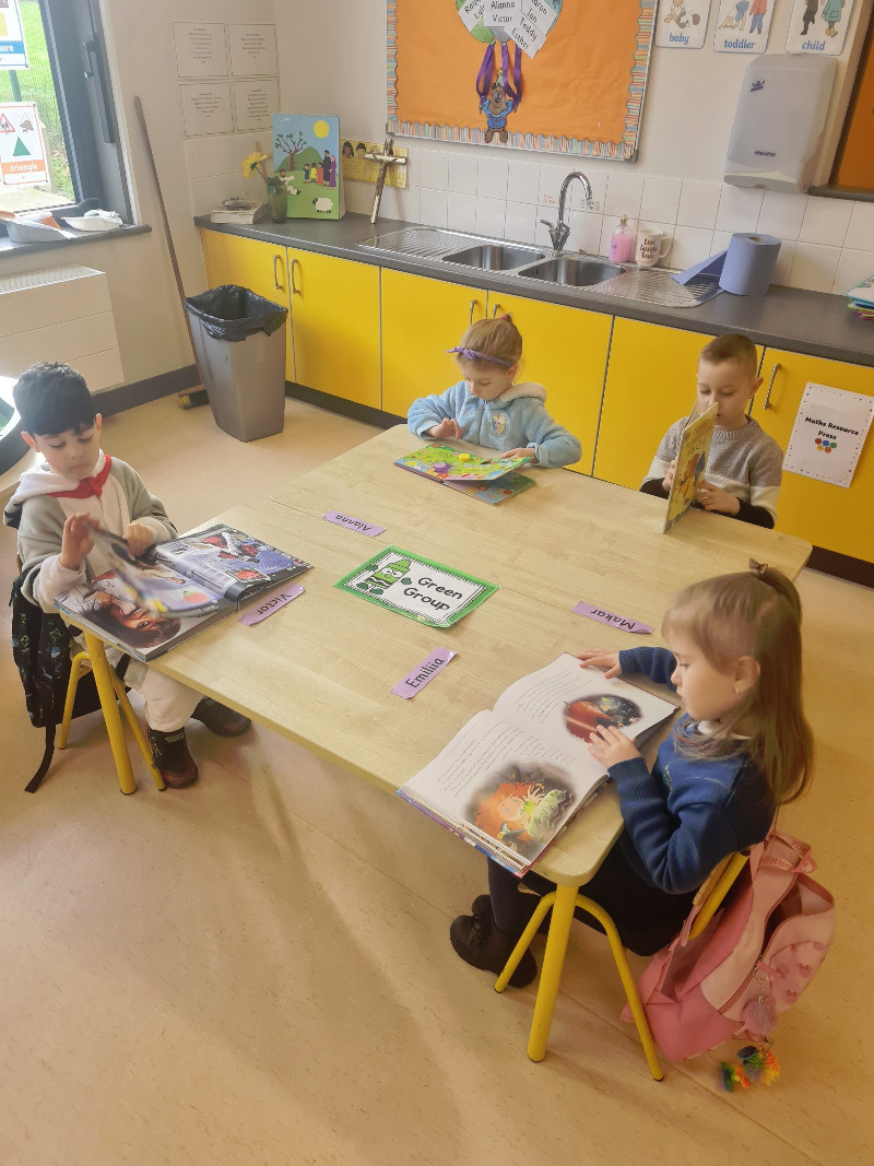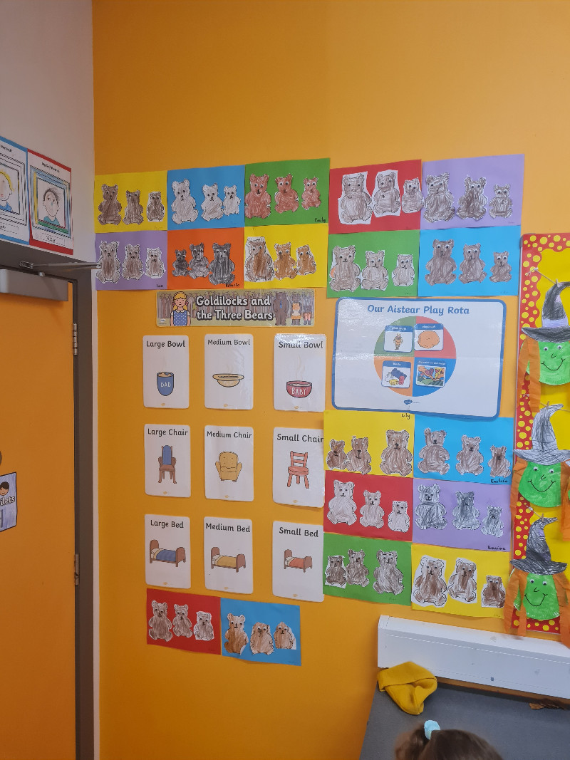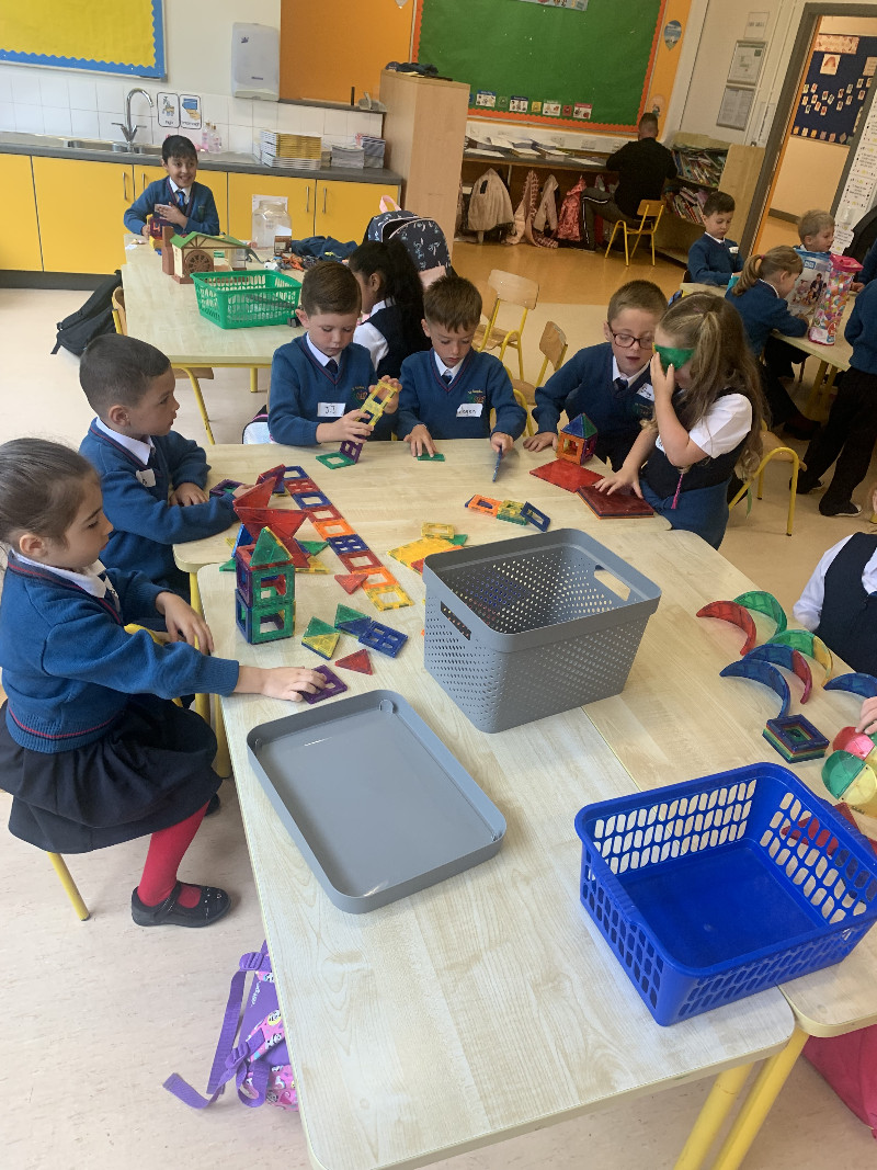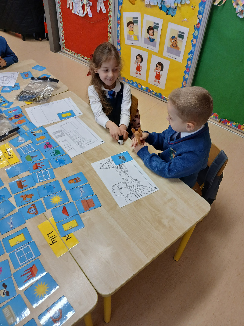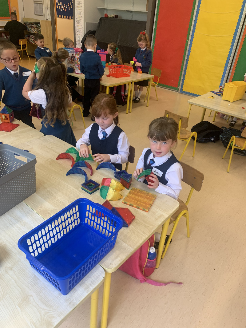 In Aistear we have been learning all about school. We particularly enjoyed the role play area where we took on the roles of teacher, secretary, SNA, caretaker, principal, etc. In our groups we collaboratively drew our dream school and we also designed our very own school jumpers. In the construction area we designed our own school buildings!