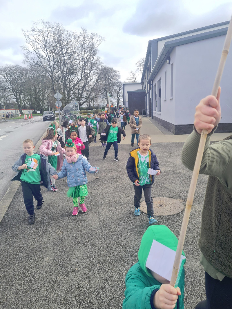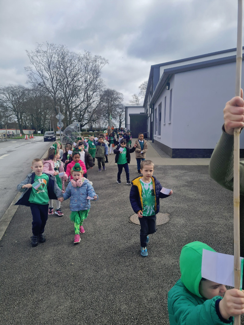 We had so much fun on green day! We had a céilí in the hall and performed An Damhsa Mór. We also marched in a parade all around the school and waved our flags high!